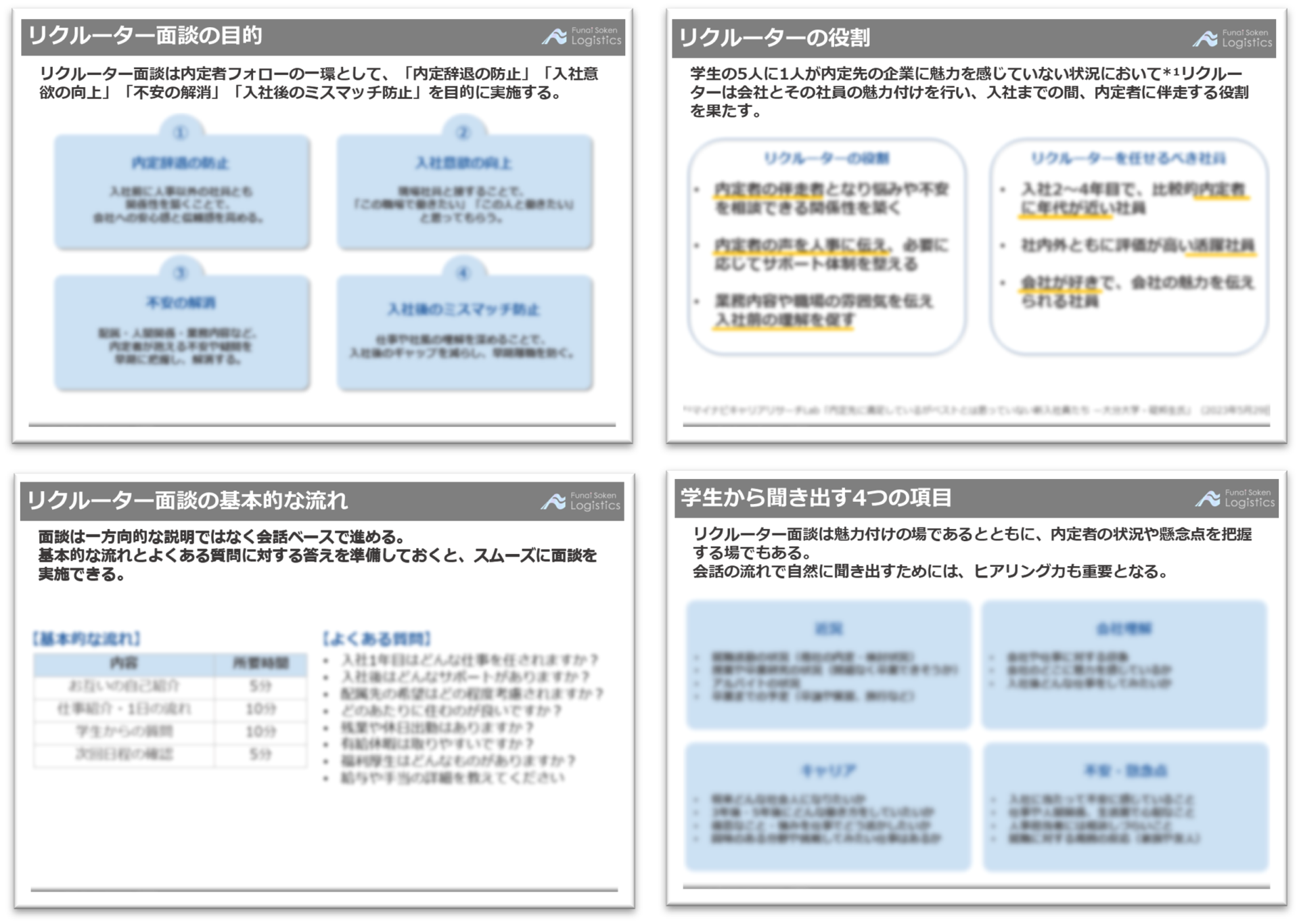 優秀な内定者を確実に迎え入れるため、リクルーターが果たすべき4つの役割と適任者の選出基準を明確化 。さらに、形式的な面談に終わらせず、学生の本音と懸念点を聞き出す具体的なヒアリング項目(近況、キャリア、不安点など4項目)と、面談の基本的な流れを公開します 。