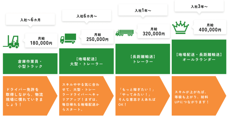 「3年間経験を積んでトレーラードライバーとして成長すれば月給40万円が見える」という明確なゴールを提示しモチベーションを高めています。成長曲線が明確であるということは、逆に入社時の給料が低いことにも納得することができます。