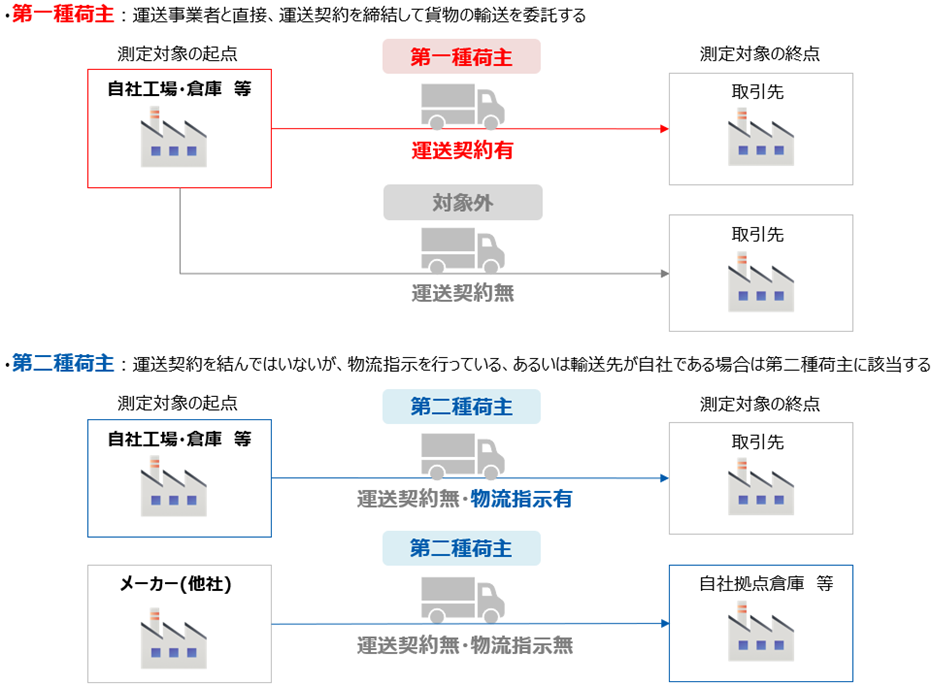 自社が運送契約を締結し、運賃を支払っているものは、自社が第一種荷主に該当する為、基本的に測定対象に含まれます。例えば、自社が運送事業者と契約し、得意先まで商品を納品する輸送などが当てはまります。但し、運送契約を結んでいない場合であっても、算定対象となるケースがありますので、注意が必要です。